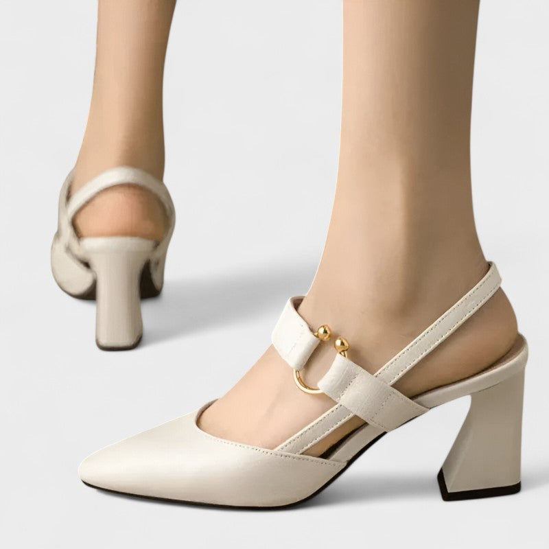 Um sapato de salto que une elegância e modernidade com um design único. O detalhe metálico adiciona um toque sofisticado e distinto, enquanto o salto estruturado garante presença marcante em qualquer ocasião.