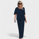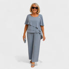 Este conjunto sofisticado une conforto e charme num visual pensado para mulheres confiantes. A blusa fluida com camadas assimétricas confere movimento e delicadeza, enquanto as calças de corte reto garantem um caimento impecável.