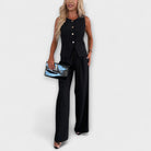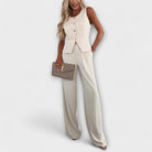 Este conjunto sem mangas com calças de corte largo é a definição de sofisticação moderna. Com linhas limpas, corte impecável e um toque de alfaiataria contemporânea, é perfeito para ocasiões formais, reuniões, eventos ou jantares onde a imagem faz a diferença.