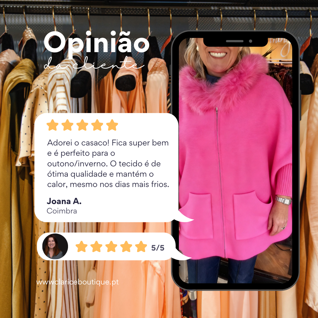 Comprei 2 casacos na Clarice Boutique. São lindíssimos, super elegantes e chegaram super rápido. Estou encantada, recomendo muito!