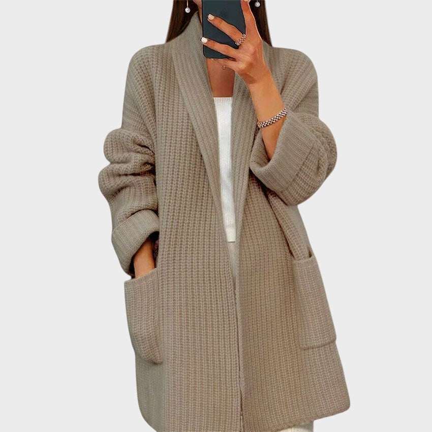 Este cardigan em malha é a peça perfeita para quem procura praticidade sem abrir mão da elegância. O seu design descontraído com bolsos laterais torna-o funcional, enquanto a textura de tricot acrescenta um toque acolhedor e moderno.