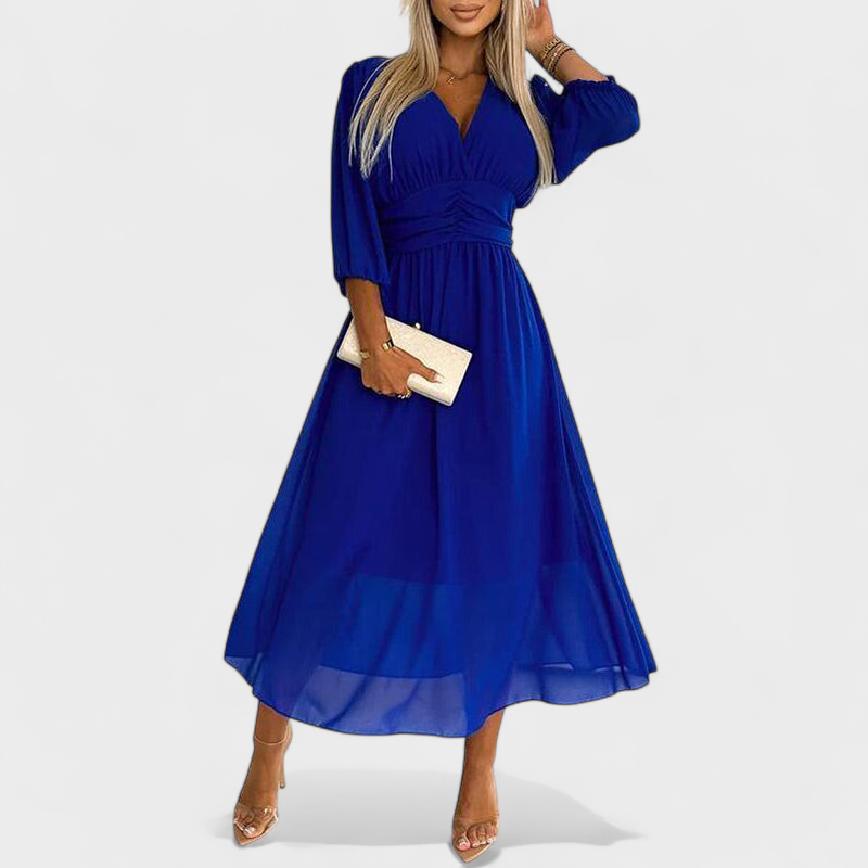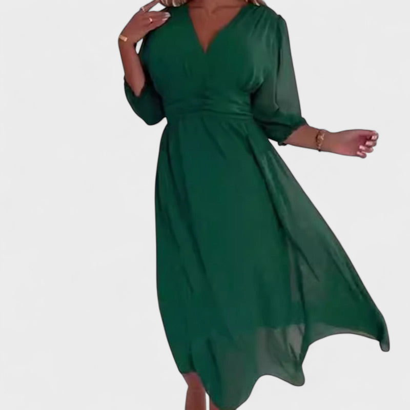 Este vestido midi com decote em V e mangas três quartos combina sofisticação e conforto num design intemporal. A cintura marcada realça a silhueta, enquanto a saia fluida com corte assimétrico acrescenta movimento e leveza ao visual.