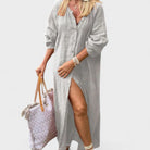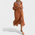 Este vestido de linho é a peça essencial para quem procura conforto, frescura e estilo descontraído num só look. Com botões ao longo da frente, corte amplo e mangas que podem ser usadas subidas ou soltas, adapta-se facilmente a diferentes ocasiões.