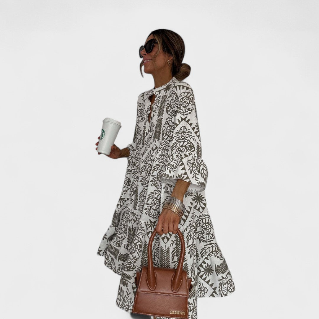 Este vestido tipo kaftan é a definição perfeita de conforto com atitude. O seu corte solto, aliado aos detalhes estampados, confere um visual leve, sofisticado e descontraído.