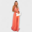 Deslumbra em cada passo com este vestido maxi em tom damasco — leve, fluido e absolutamente inesquecível. Ideal para eventos especiais, festas de verão ou jantares ao pôr do sol, este modelo com decote profundo e tecido esvoaçante garante uma entrada triunfante e sofisticada, sem esforço.