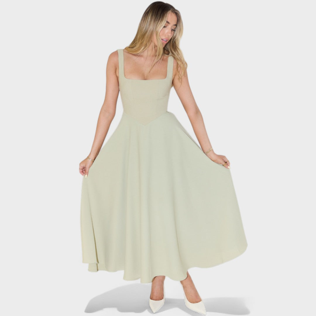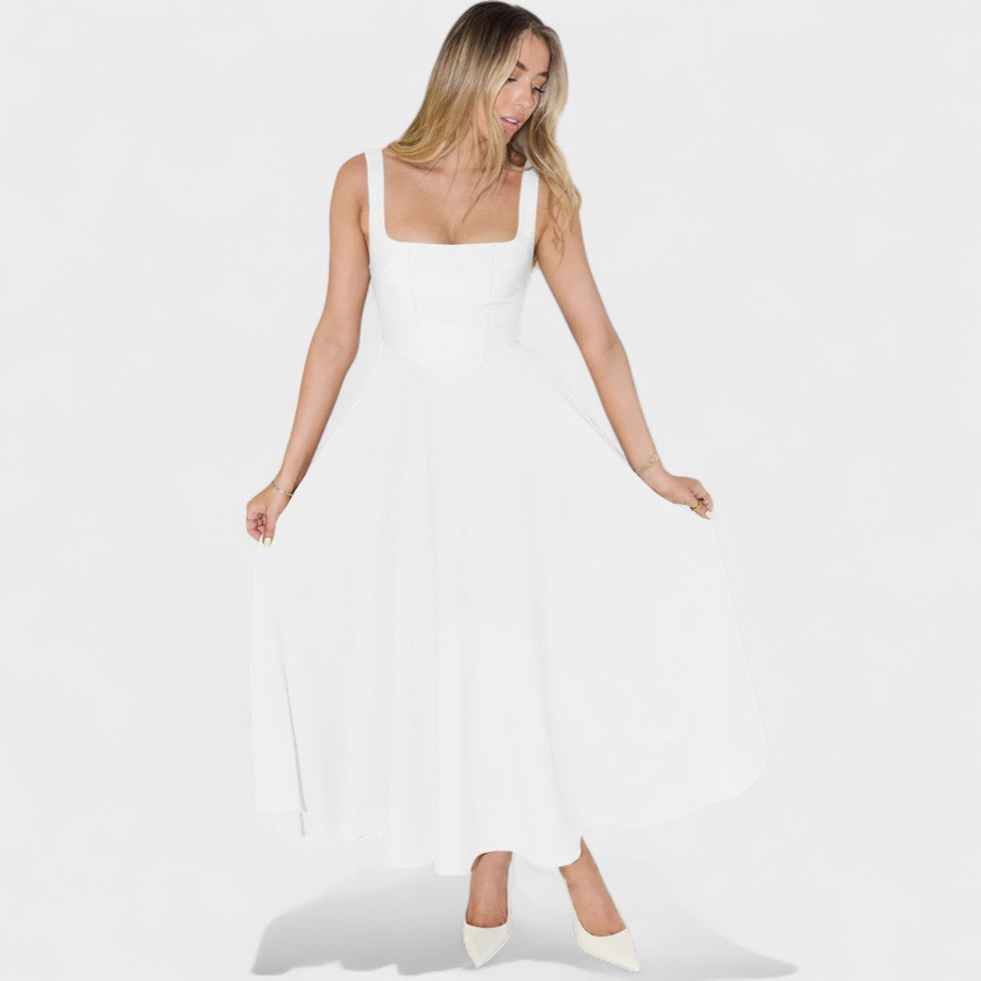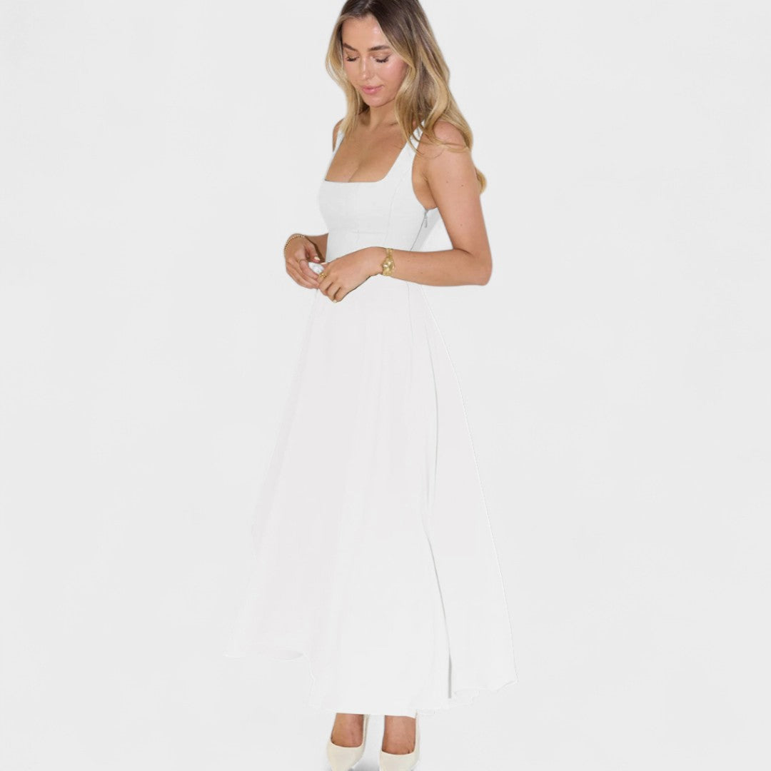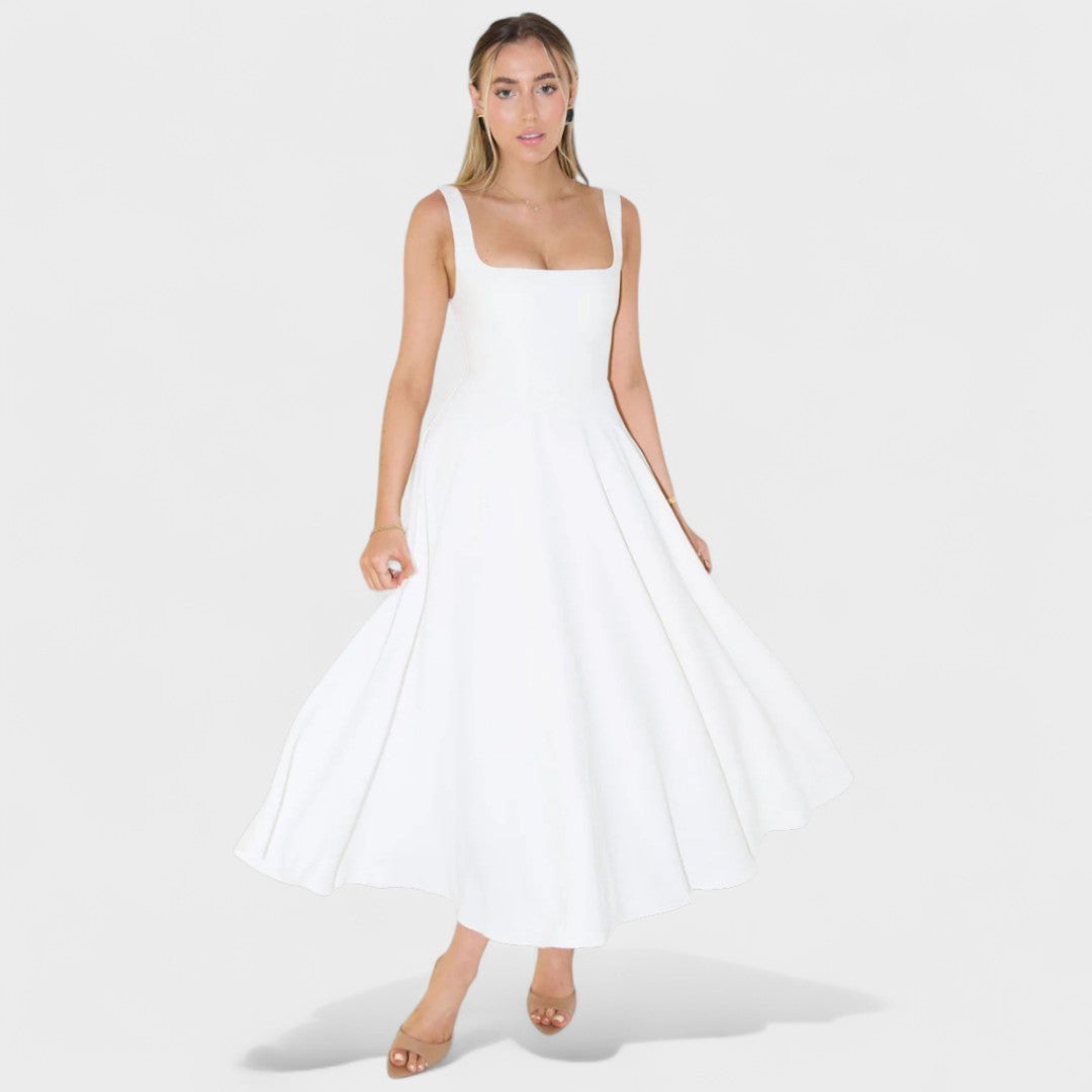 Este vestido é a definição de intemporalidade com um toque moderno. O corte justo na parte superior, com alças largas e decote reto, valoriza a silhueta com subtileza, enquanto a saia fluida confere movimento e graça.