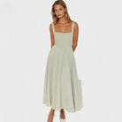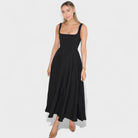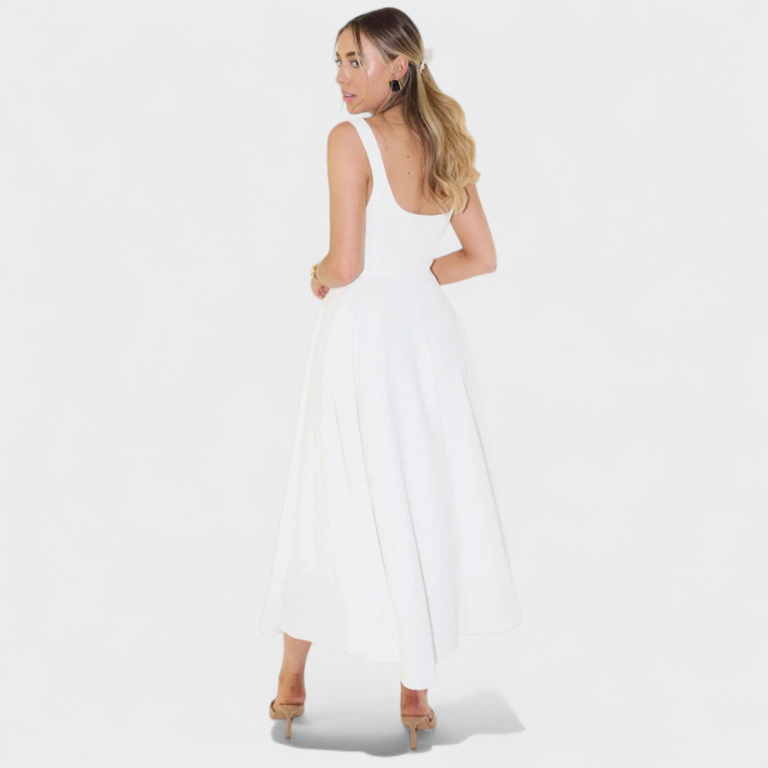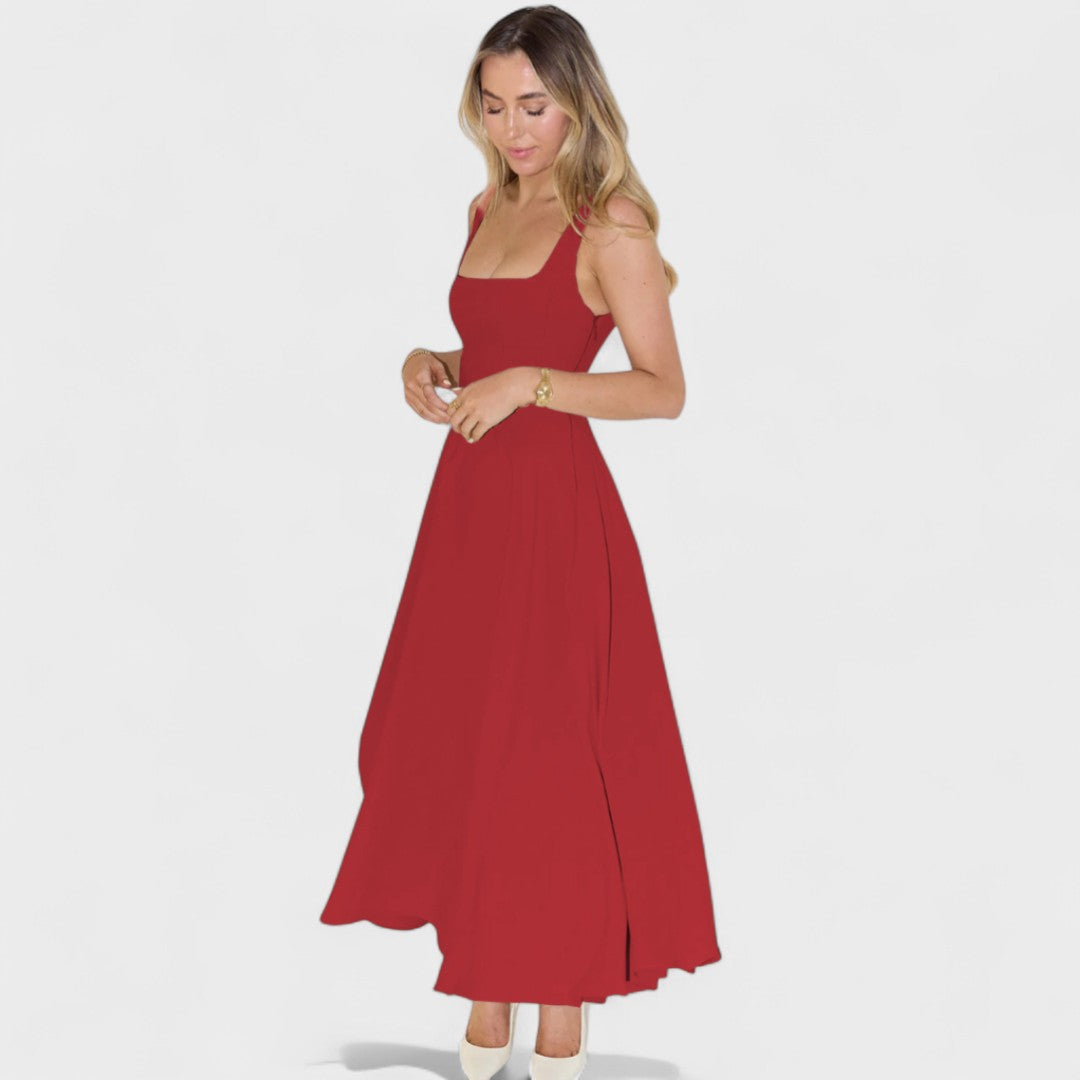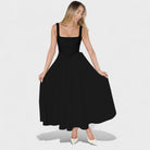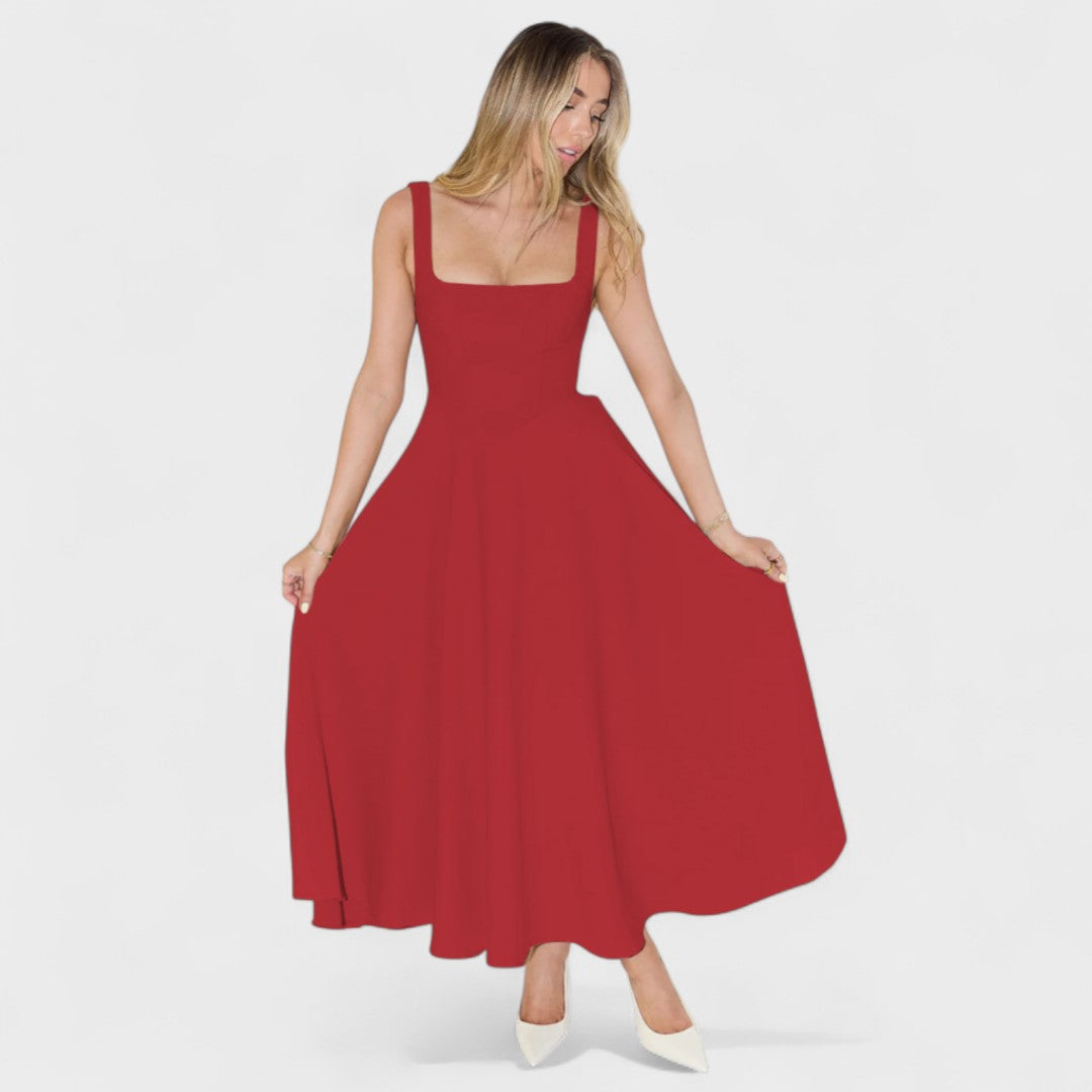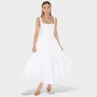 Este vestido é a definição de intemporalidade com um toque moderno. O corte justo na parte superior, com alças largas e decote reto, valoriza a silhueta com subtileza, enquanto a saia fluida confere movimento e graça.