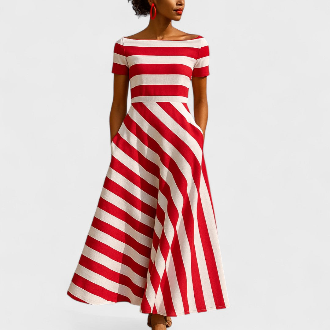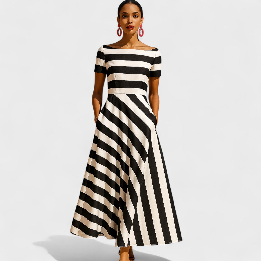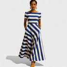 Este vestido longo com padrão às riscas e corte evasé foi pensado para valorizar a silhueta de forma elegante e confortável. O decote canoa acrescenta um toque clássico, enquanto o corte estruturado e fluido garante liberdade de movimento.