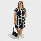 Este vestido camiseiro preto com padrão gráfico em branco é a escolha perfeita para quem procura um look moderno, versátil e cheio de personalidade. Com um corte solto que favorece todos os tipos de corpo, combina elegância casual com um toque descontraído, ideal para os dias em que quer estar bonita sem abrir mão do conforto.