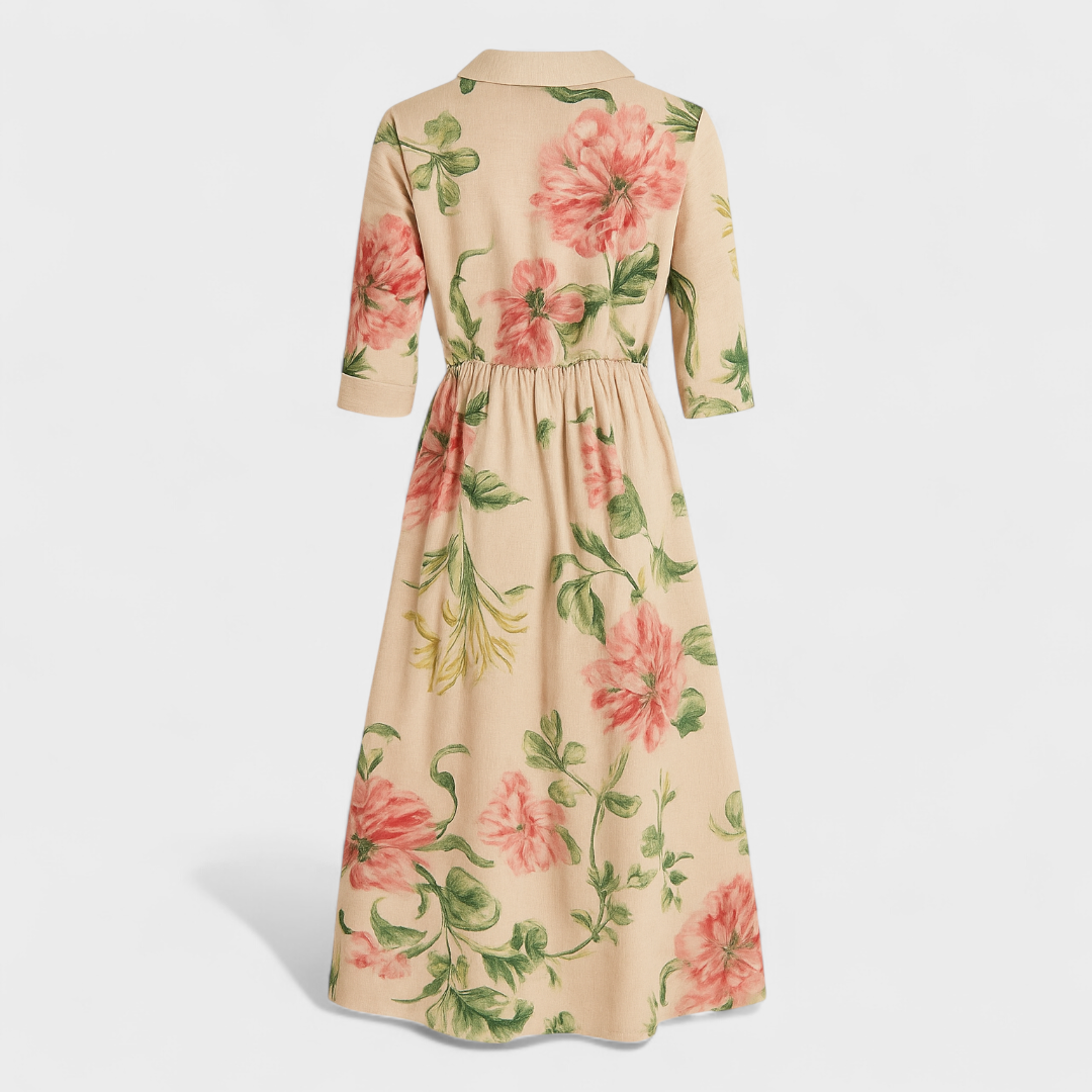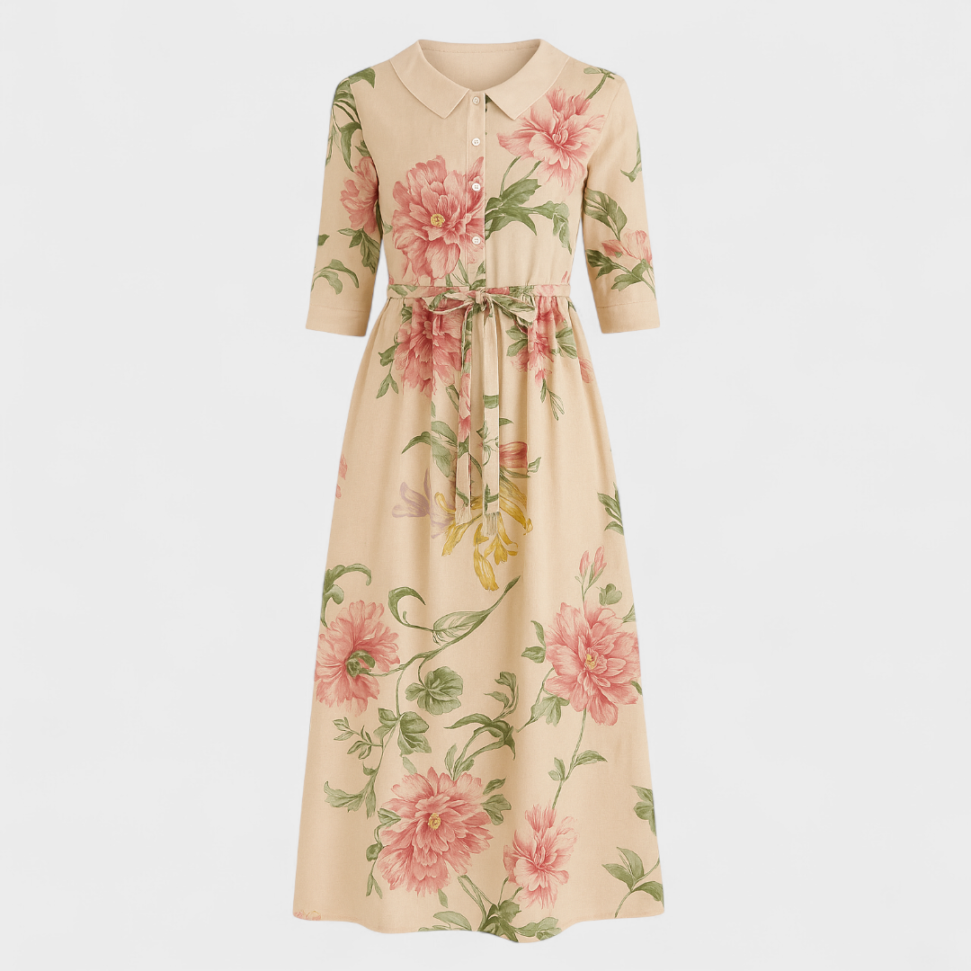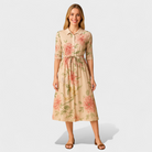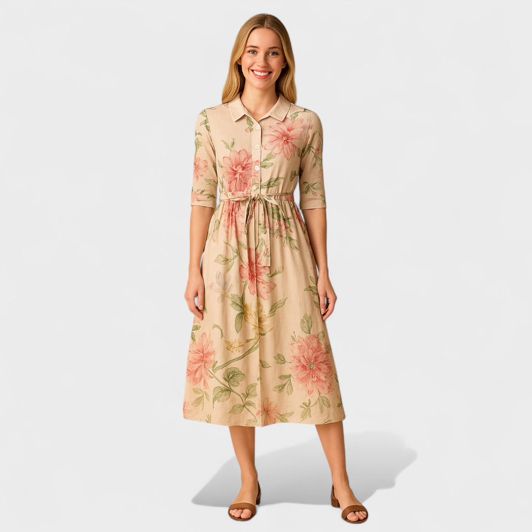 Este vestido é a escolha perfeita para quem procura combinar romantismo e frescura no dia a dia. Com corte midi elegante, detalhe de botões frontais e cintura ajustável, valoriza a silhueta de forma delicada.
