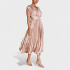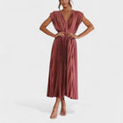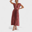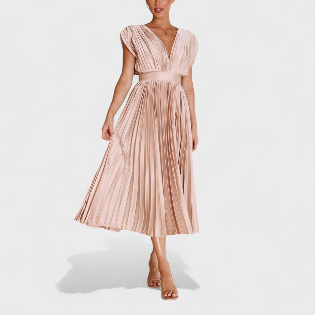 Este vestido franzido, com decote em V profundo e corte fluido, é o exemplo perfeito de como o minimalismo pode ser absolutamente deslumbrante. Ideal para ocasiões especiais ou jantares elegantes, ele realça a silhueta com um caimento leve e sofisticado, fazendo com que se sinta confiante e elegante sem esforço.