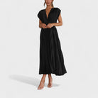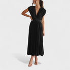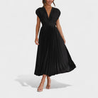 Design atemporal — O plissado e o preto clássico tornam este vestido uma peça versátil que nunca sai de moda.