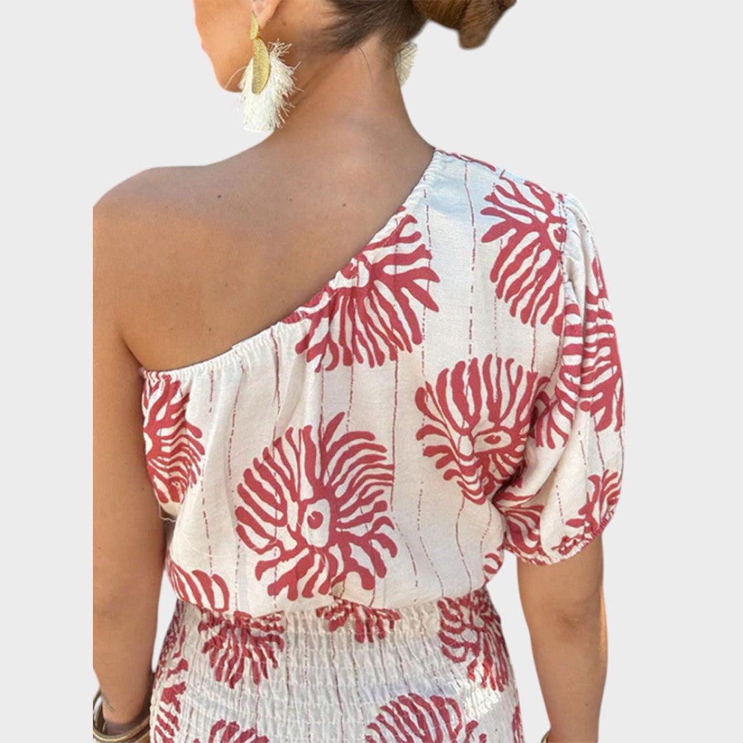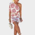 Este vestido de um ombro só é a combinação perfeita entre ousadia e elegância. O corte assimétrico valoriza a silhueta de forma subtil e moderna, enquanto os detalhes estampados trazem uma energia vibrante e divertida.