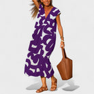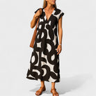 Este vestido midi destaca-se pelo seu padrão gráfico moderno e arrojado, que confere personalidade a qualquer coordenado. O corte solto e confortável, aliado ao decote em V e às mangas ligeiramente estruturadas, resulta numa peça prática mas cheia de estilo.