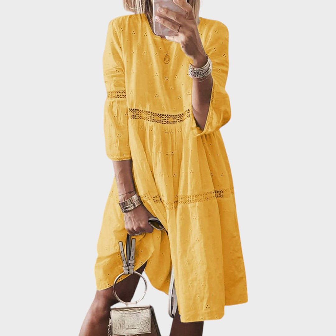 Este vestido vibrante é a definição perfeita de liberdade e elegância casual. Com um corte fluído, detalhes rendados delicados e um tecido leve com bordados, ele oferece um toque boho-chic que encaixa perfeitamente em dias de verão, passeios descontraídos ou encontros especiais.