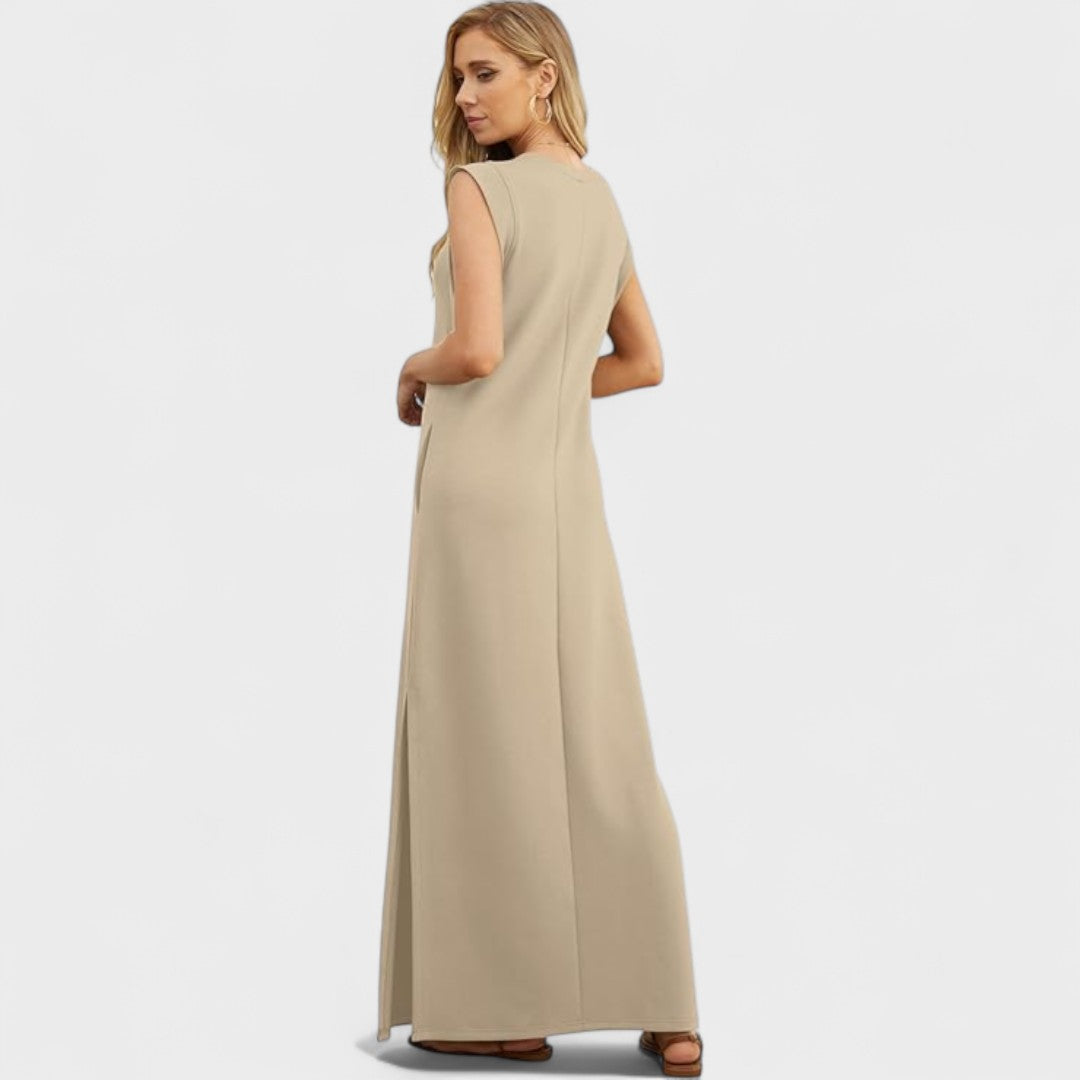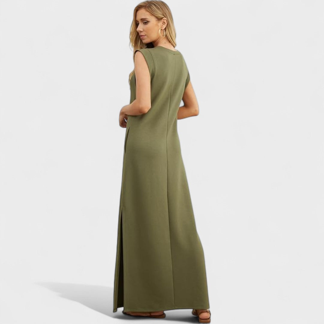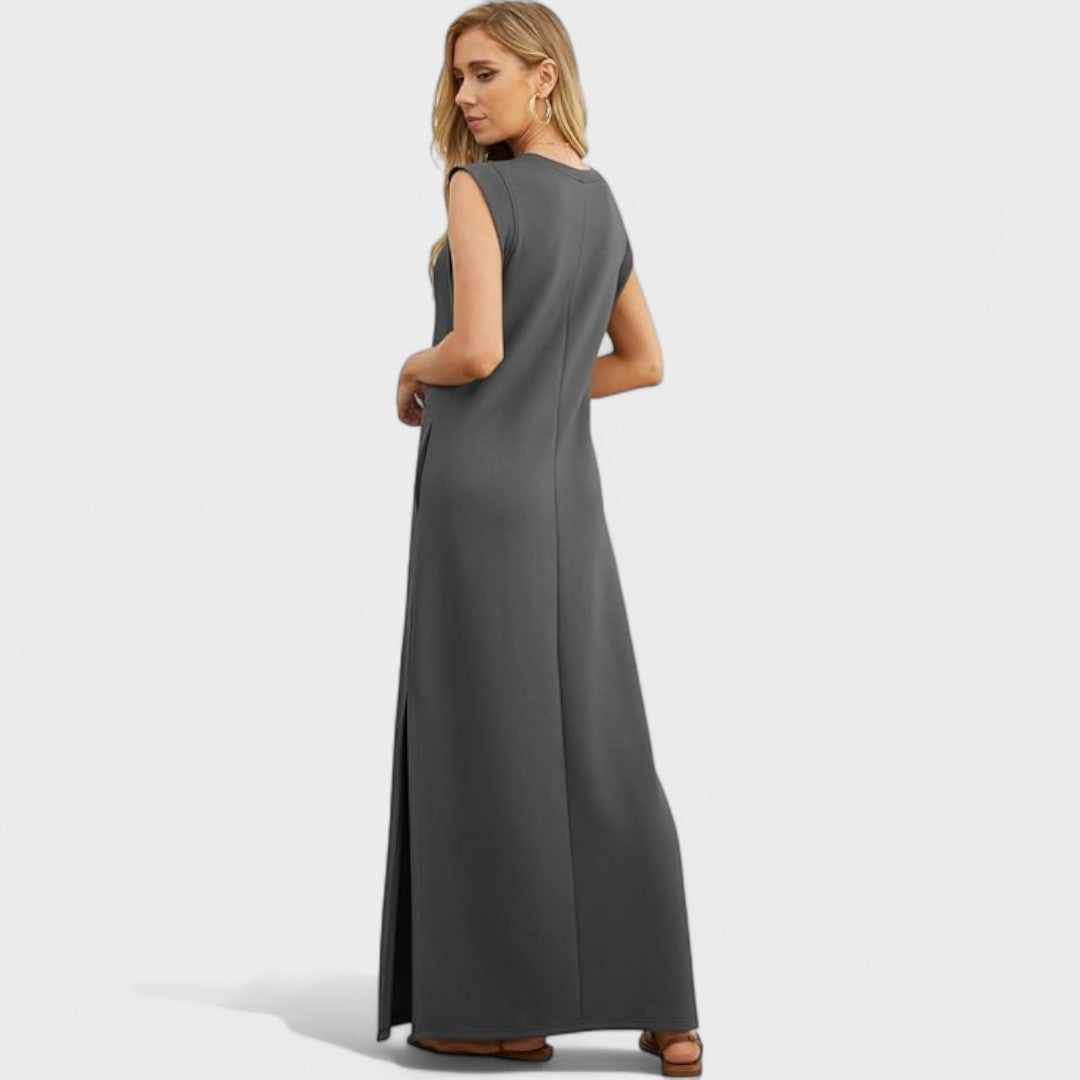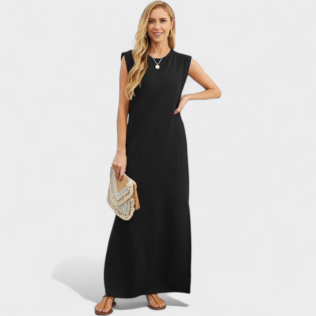 Este vestido maxi prova que o estilo está nos detalhes. Com um corte reto, ombros marcados e um design minimalista, adapta-se perfeitamente a diferentes ocasiões — desde um dia descontraído na cidade até a um jantar elegante.