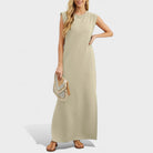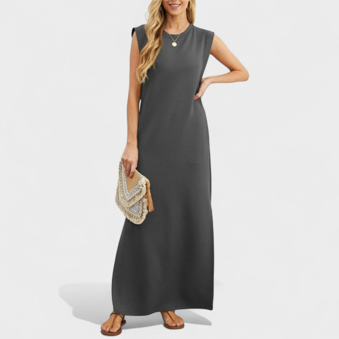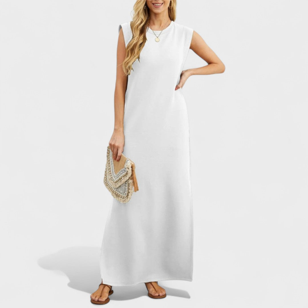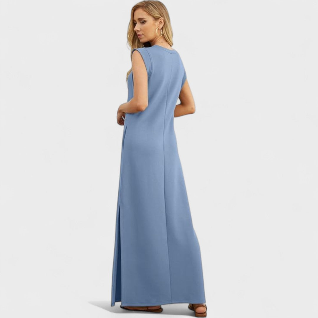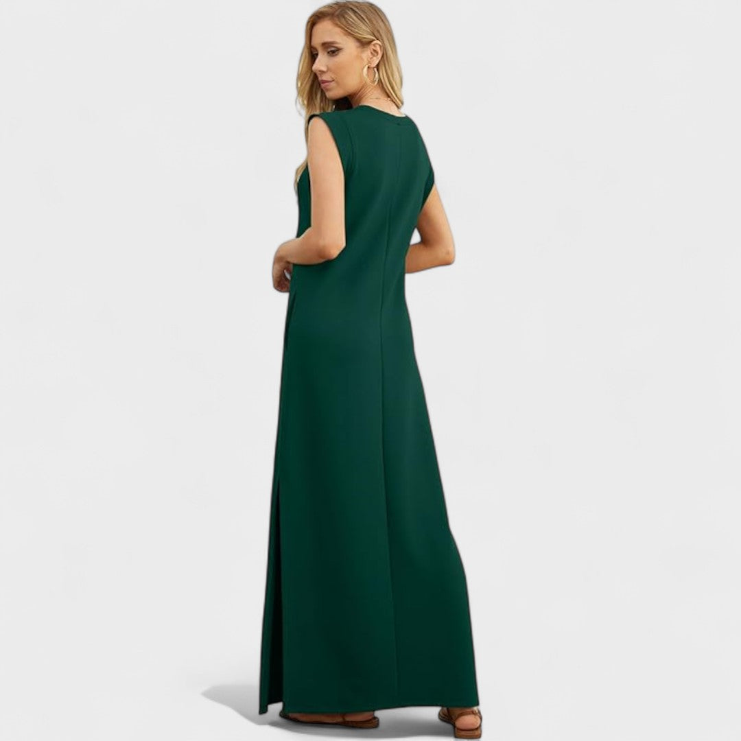 Este vestido maxi prova que o estilo está nos detalhes. Com um corte reto, ombros marcados e um design minimalista, adapta-se perfeitamente a diferentes ocasiões — desde um dia descontraído na cidade até a um jantar elegante.