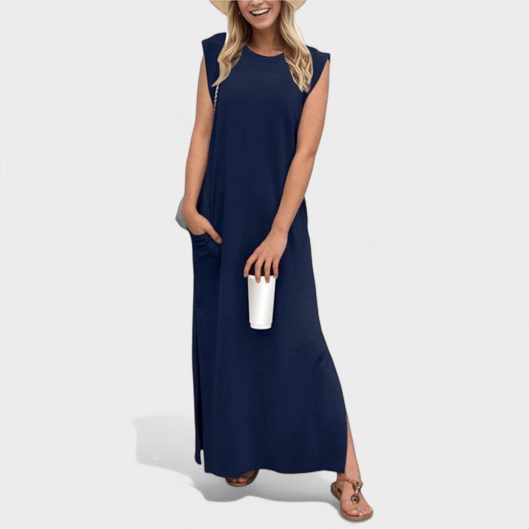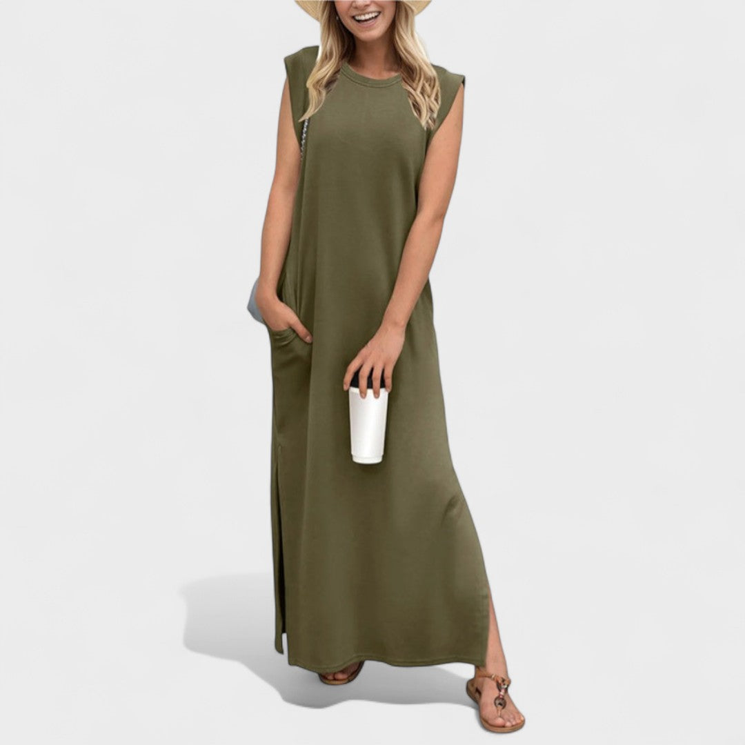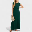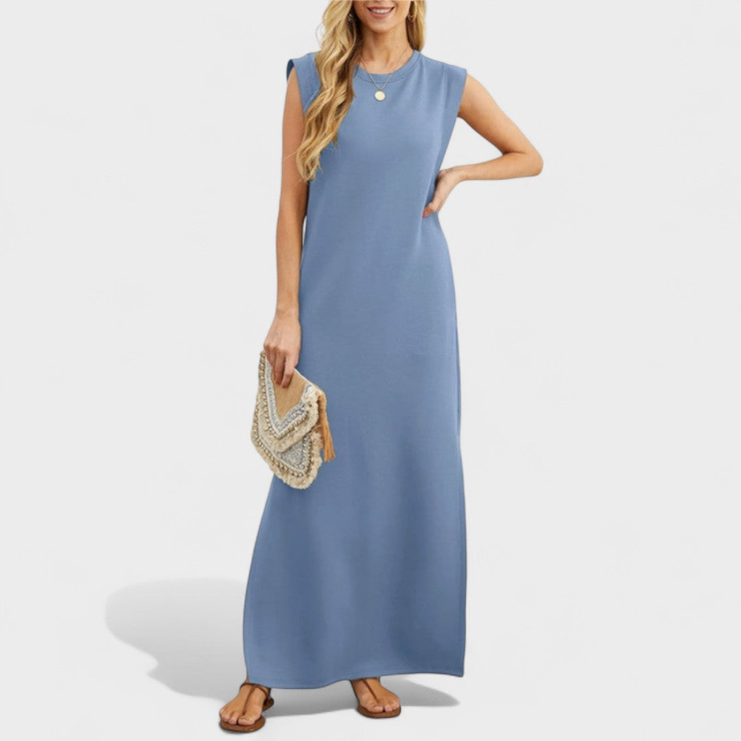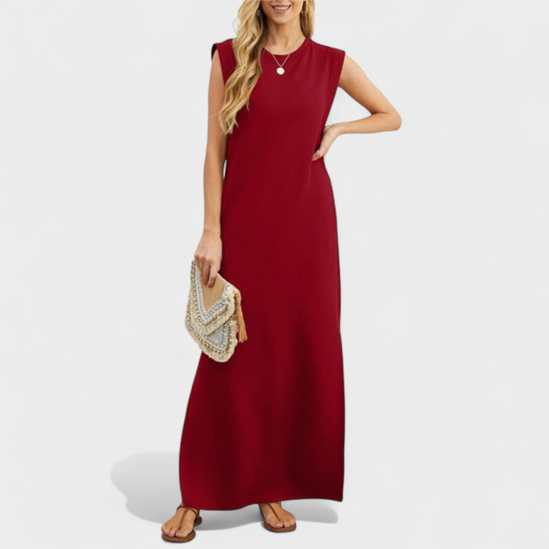 Este vestido maxi prova que o estilo está nos detalhes. Com um corte reto, ombros marcados e um design minimalista, adapta-se perfeitamente a diferentes ocasiões — desde um dia descontraído na cidade até a um jantar elegante.