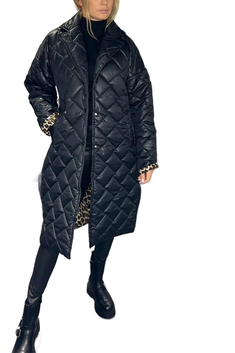 Este casaco acolchoado combina sofisticação e funcionalidade, ideal para os dias frios sem perder o estilo. O seu design comprido e o interior com padrão subtil oferecem um visual moderno e requintado — perfeito para quem quer estar quente e elegante ao mesmo tempo.