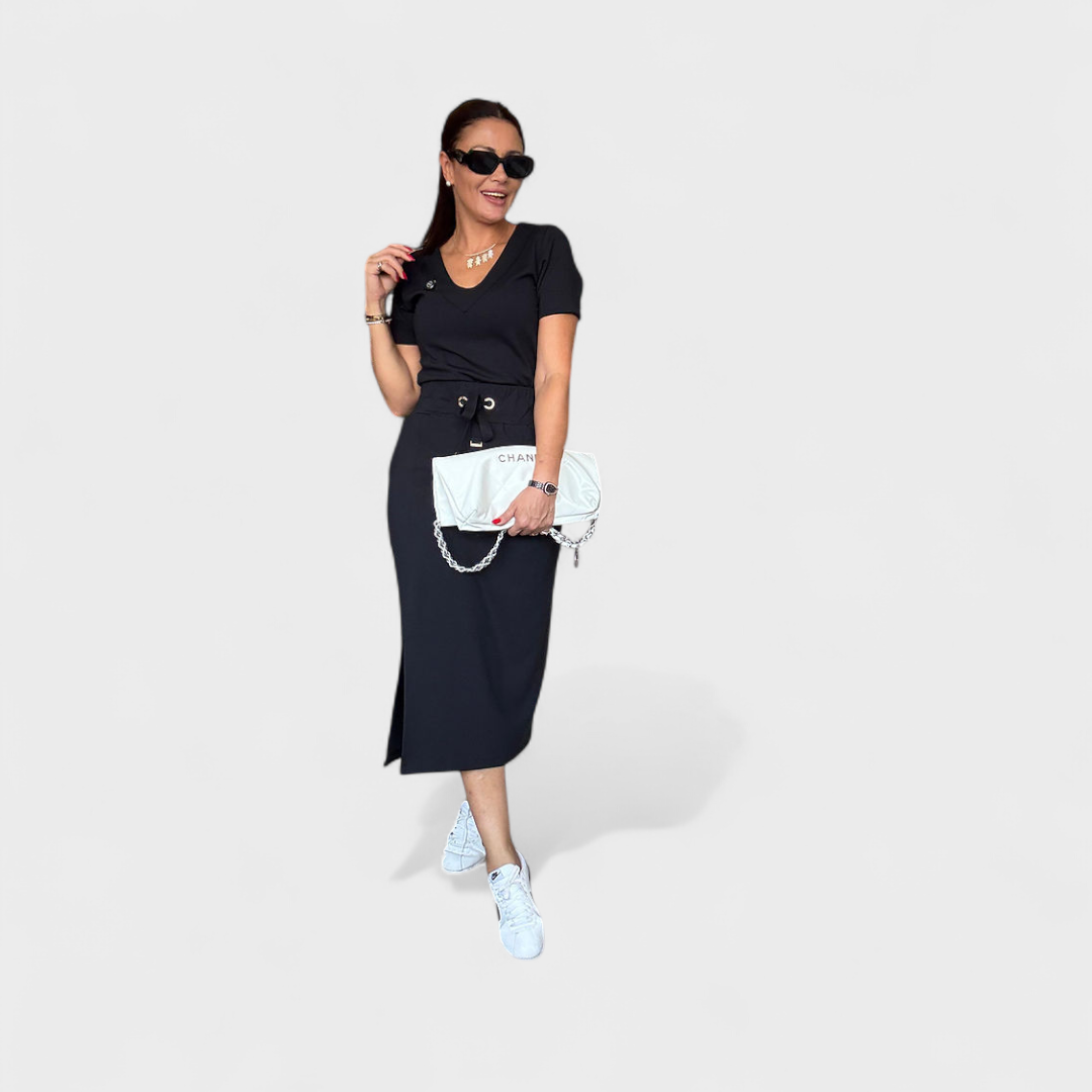 Este vestido midi de corte simples é a fusão perfeita entre conforto e elegância. Com decote em V e detalhe de cordão na cintura, oferece um ajuste personalizado que valoriza a silhueta. A racha lateral acrescenta mobilidade e um toque moderno.