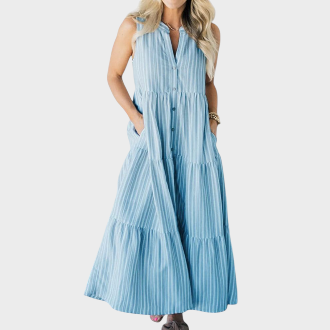 Este vestido é a escolha perfeita para quem procura conforto aliado a um visual moderno e descontraído. O corte solto e fluído, aliado ao padrão às riscas, garante frescura e movimento em qualquer ocasião. Ideal para o dia-a-dia ou momentos de lazer, é uma peça prática e versátil que nunca sai de moda.