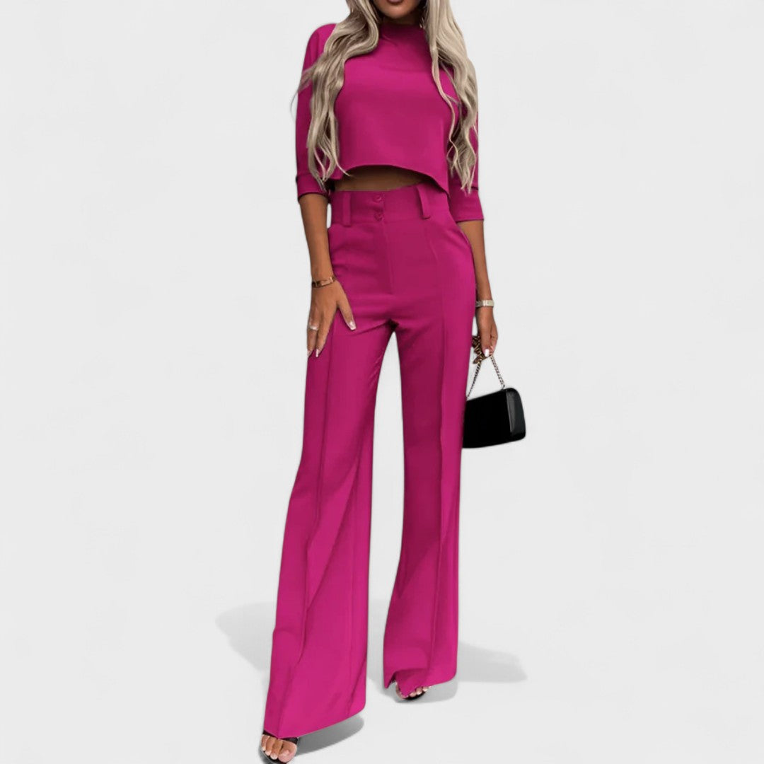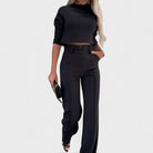 Este conjunto é a escolha perfeita para quem procura um visual elegante e contemporâneo com um toque de ousadia. O top cropped aliado à calça de cintura subida cria uma silhueta sofisticada, ideal tanto para eventos descontraídos como para um look de trabalho com personalidade.