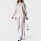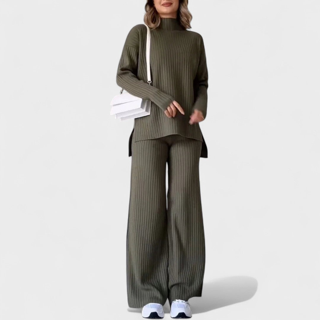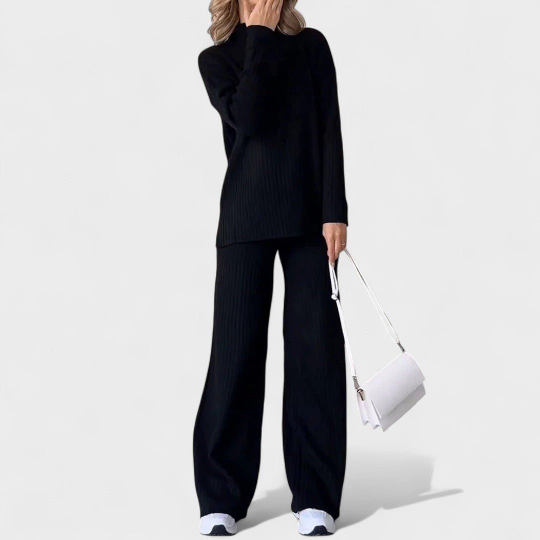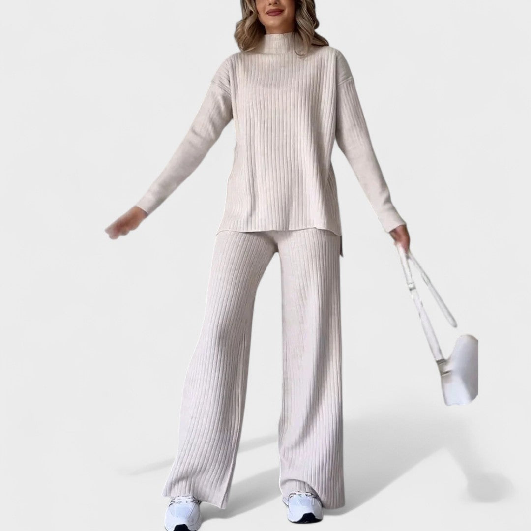 Este conjunto em malha canelada é a escolha perfeita para quem procura unir conforto e elegância num só look. Com um corte moderno e descontraído, oferece liberdade de movimentos e um toque suave na pele.
