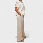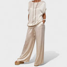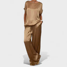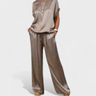Este conjunto fluido é a definição perfeita de equilíbrio entre sofisticação e descontração. Com um tecido de toque sedoso e corte amplo, proporciona liberdade de movimentos e uma sensação de leveza incomparável.