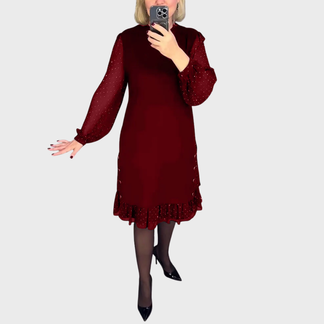 O acabamento com pequenos folhos e o detalhe metálico lateral trazem movimento e encanto, ideal para jantares, celebrações e eventos especiais de fim de ano.