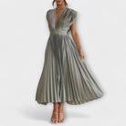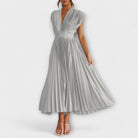 Este vestido com decote em V é uma escolha elegante e sofisticada. O decote em V adiciona um toque de sensualidade, enquanto o design clássico e atemporal faz dele uma opção versátil para diversas ocasiões, como eventos formais, jantares ou até mesmo para o dia a dia.
