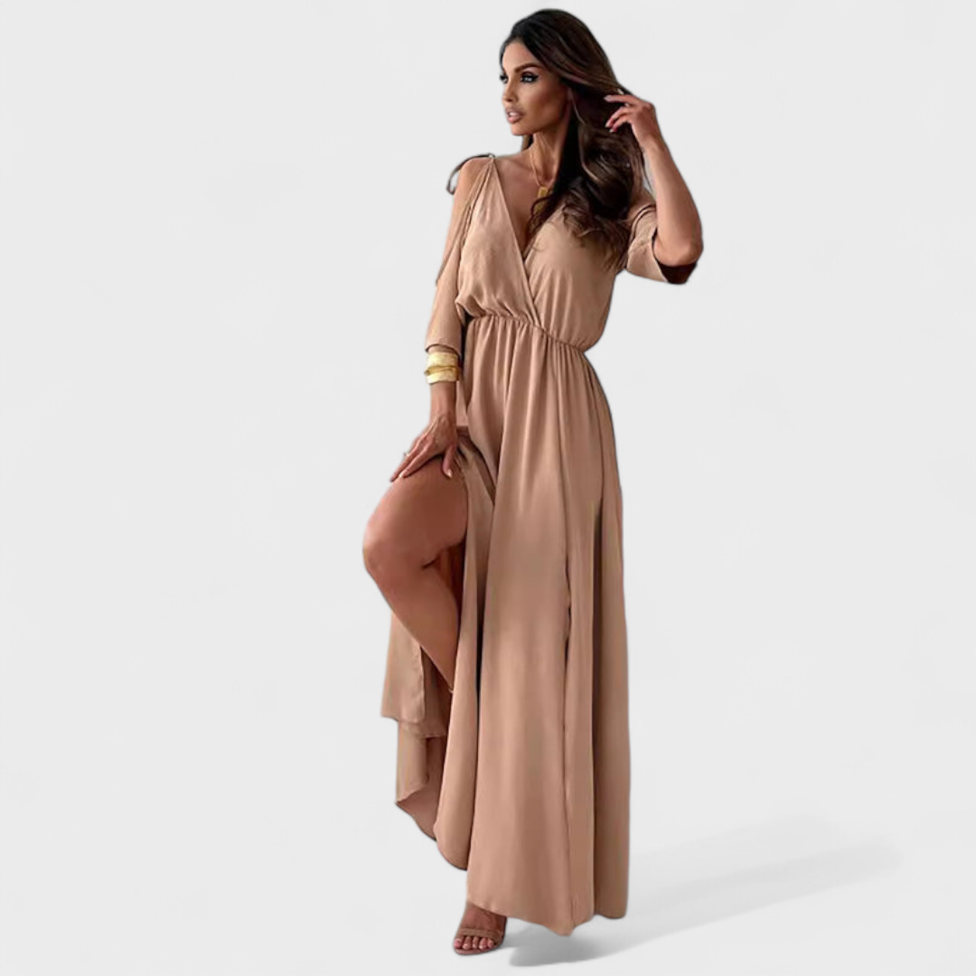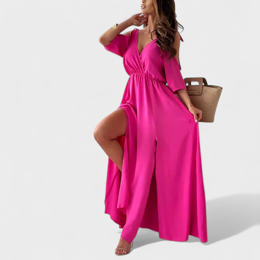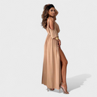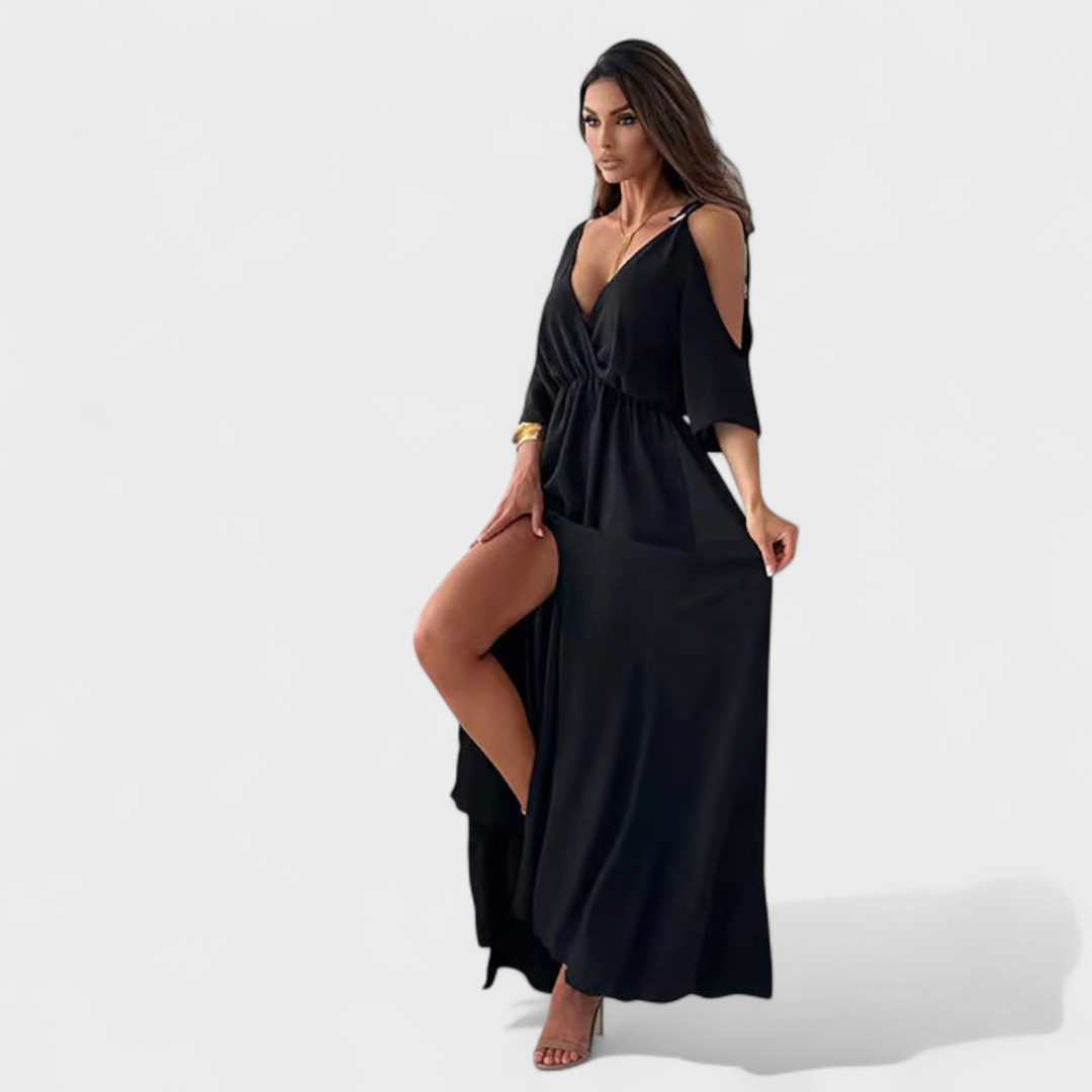 Este vestido é a expressão máxima de elegância moderna. O corte fluído e o decote cruzado criam uma silhueta feminina e envolvente, enquanto a abertura lateral acrescenta ousadia e movimento.