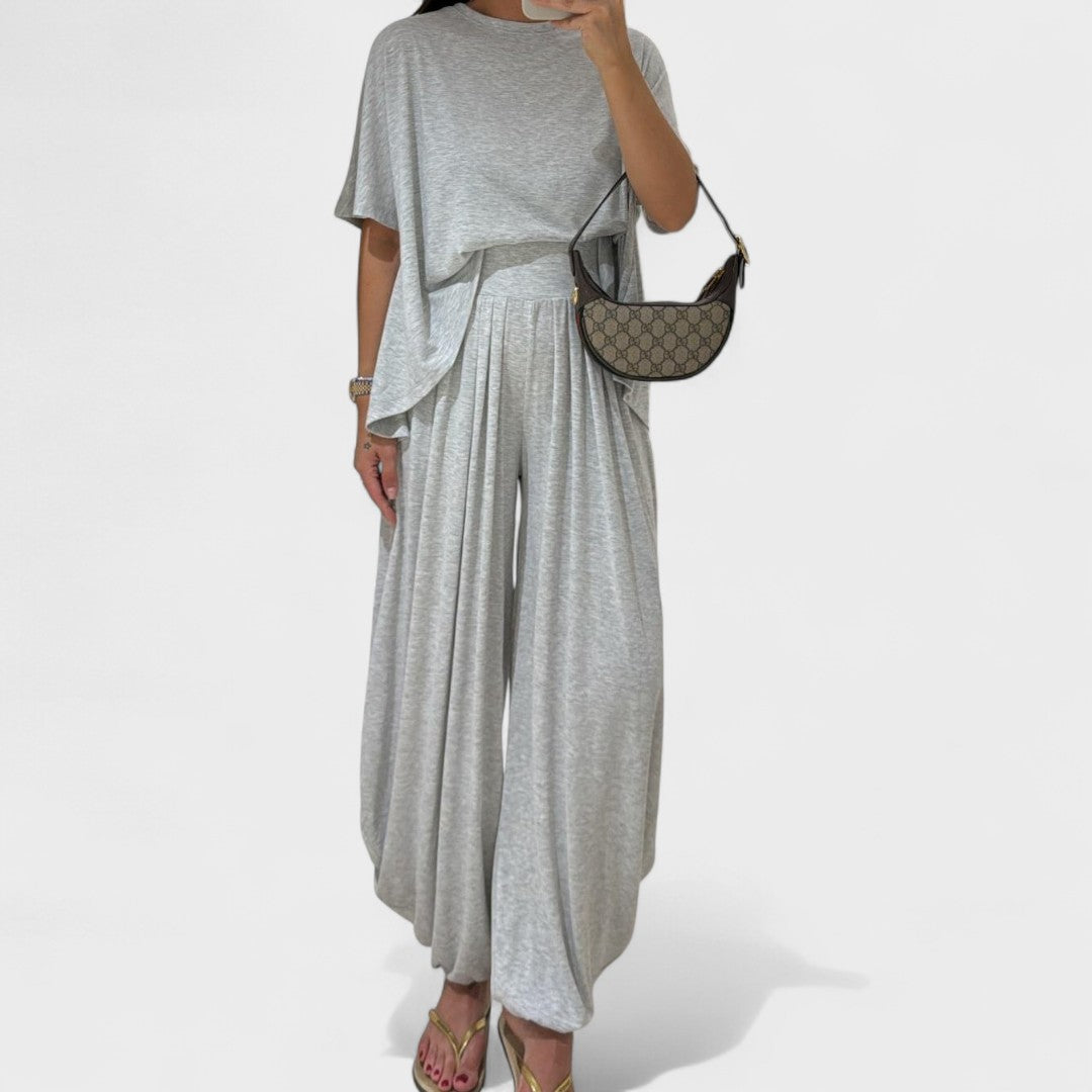 Este conjunto é a fusão perfeita entre conforto e sofisticação. A t-shirt fluída combina-se harmoniosamente com as calças largas de corte solto, criando um visual moderno e leve.
