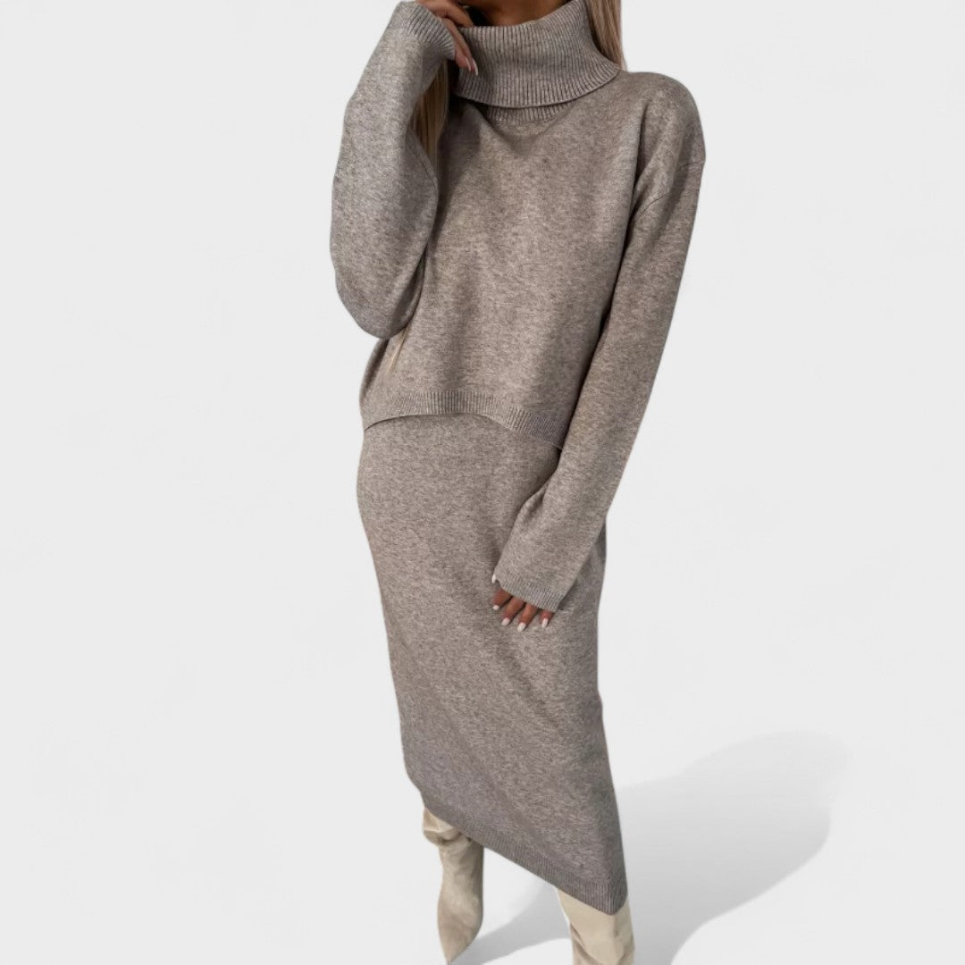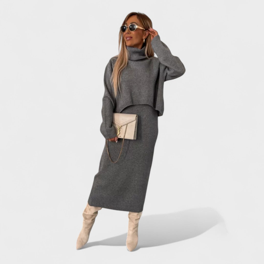 Este conjunto de malha combina dois elementos essenciais do guarda-roupa feminino: um vestido de corte simples e sofisticado, aliado a uma blusa versátil que acrescenta estilo e aconchego.