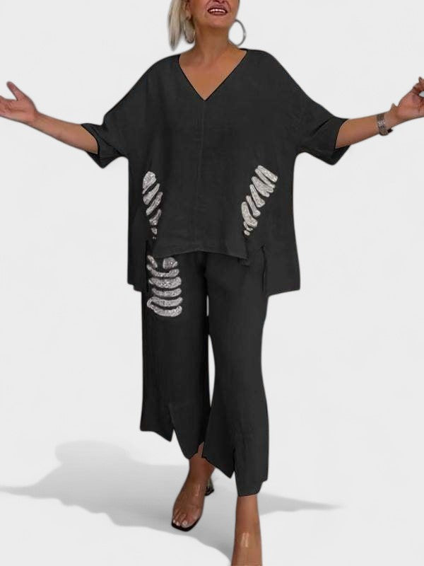 Este conjunto é a escolha perfeita para quem valoriza conforto sem abdicar da elegância. Com um corte descontraído e detalhes delicados, oferece uma silhueta fluida que respeita o movimento natural do corpo.