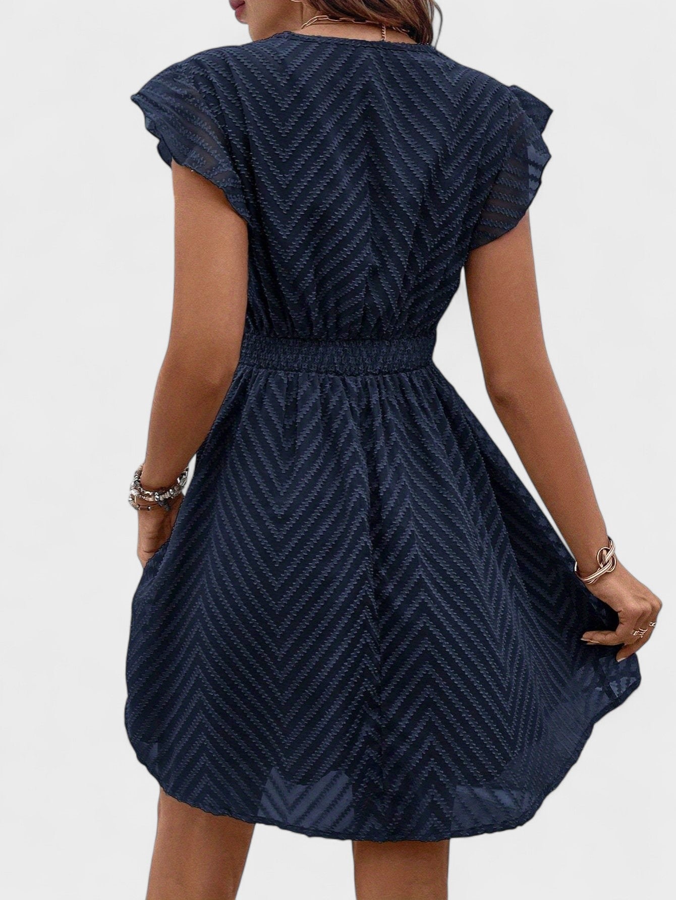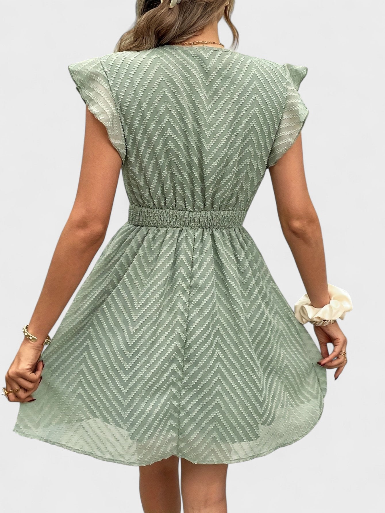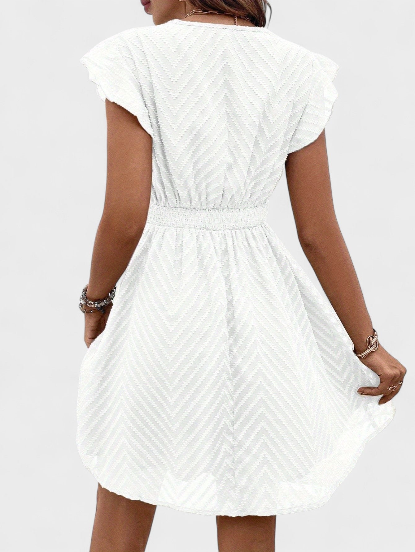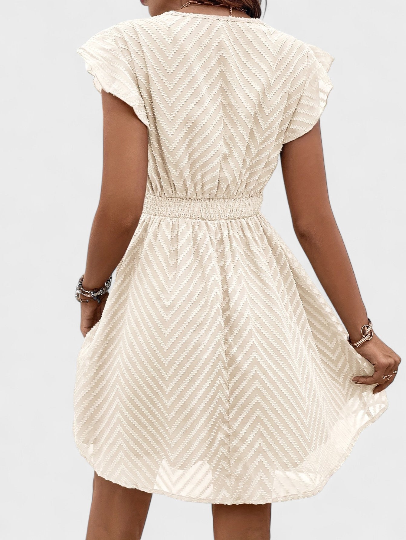 Este vestido curto com detalhes em renda é a fusão perfeita entre charme boémio e elegância descontraída. O decote em V profundo com acabamento rendado e a cintura marcada criam uma silhueta feminina e leve. As mangas suaves e o tecido texturado acrescentam ainda mais graciosidade ao look.