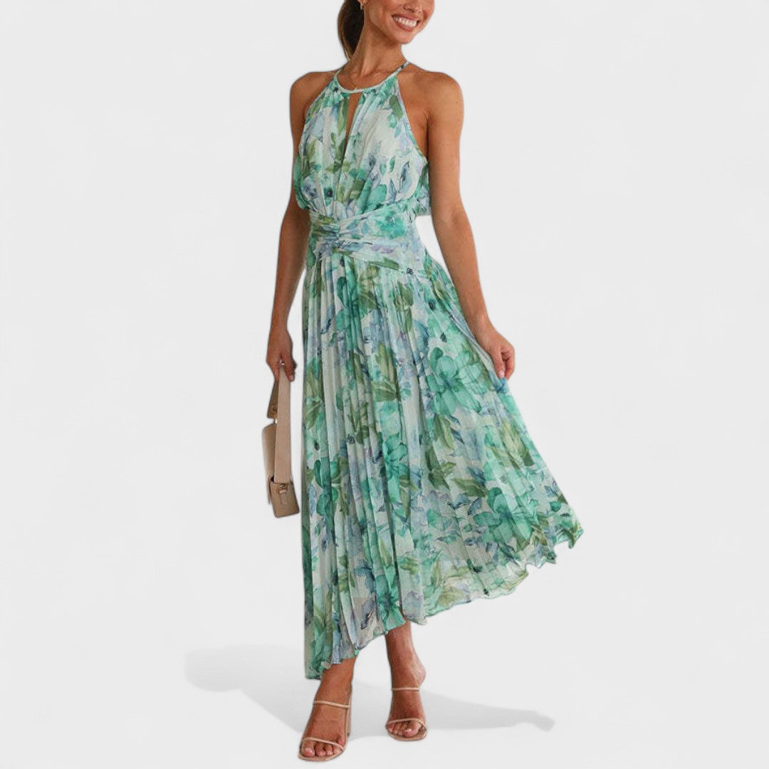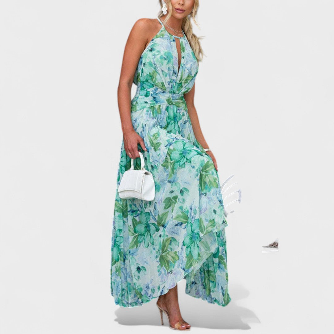 Este vestido foi feito para quem quer brilhar com naturalidade. Com um corte fluido e delicado, o seu design realça a cintura e valoriza os ombros com um decote halter sofisticado.